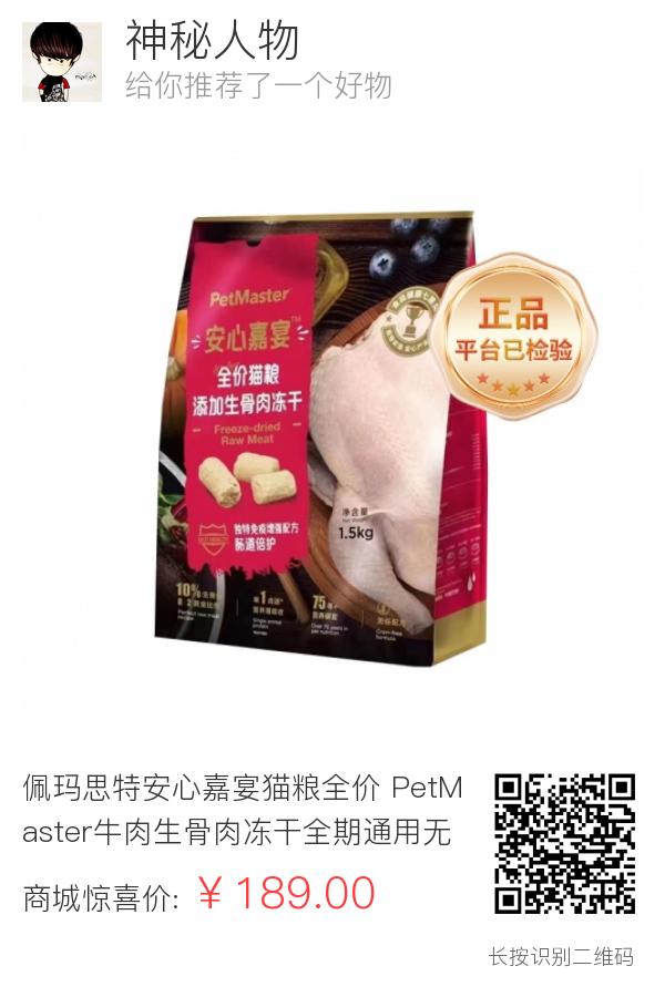 佩玛思特安心嘉宴猫粮全价 PetMaster牛肉生骨肉冻干全期通用无谷猫粮1.5kg/7.5kg