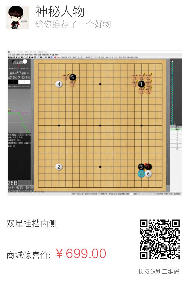 双方均为双星,第二招走对角星,双方都可以形成并排的双星,第 5 手黑在自己黑子接应的方向小飞挂,白点黑小飞挂斜对角的 33,黑挡住白进黑的势力范围方向。后续会形成双飞燕。黑不容易争胜但可下。超大型分支.